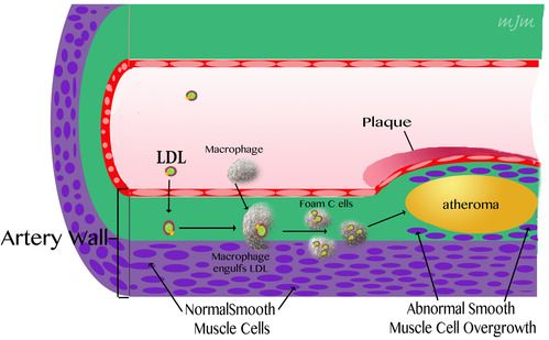 Deposits start to develop when LDL cholesterol particles (commonly referred to as "bad" cholesterol) migrate below the inner layers of the artery wall. The accumulation of these particles then attracts a type of white blood cell known as a macrophage. Macrophages engulf the LDL particles and then transform into foam cells. Over time the foam cells release their cholesterol which accumulates beneath the surface of the artery forming an atheroma. The atheroma is surrounded by an overgrowth of smooth muscle cells as well as foam cells and other inflammatory cells creating a complex structure we call a plaque.