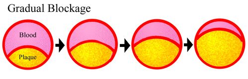 There is more than one way for a heart attack to occur. A person who has a history of chest pains that come on with exertion and then has a heart attack may have had a plaque that has gradually increased in size over years or even decades. As the opening through the artery becomes smaller and smaller the patient may start to notice chest pains when he engages in activities that make increased demands on the heart. The harder the heart works the more oxygenated blood it needs and if the artery becomes too narrow it can't deliver enough blood to meet the hearts needs. This type of pain is called angina. Initially the person may notice this only when he is climbing a steep hill or running but with time it might happen even when he is walking a few blocks on level ground. In severe cases patients may not be able to walk even a few steps to the bathroom without having angina symptoms.