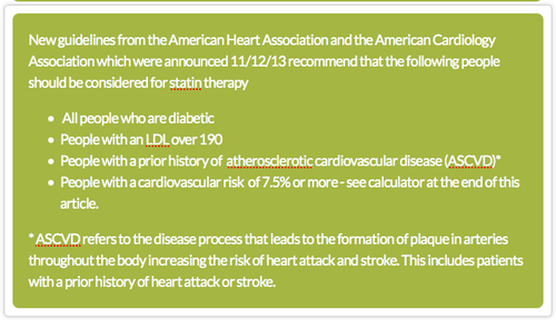 Last week saw the announcement of new cholesterol treatment guidelines published by the American Heart Association and the American Cardiology Association. Many believe that the new guidelines will result in millions of additional people being put on statin drugs like Lipitor, Zocor, Crestor, and the many generic equivalents. While this may be true the new guidelines also mean that some people who would previously have been put on statins won't need to.