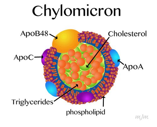You may have heard the terms "Good" and "Bad" cholesterol before. Although we call them good and bad "cholesterol" the actual cholesterol molecule ( see image at top of page) in good and bad cholesterol is exactly the same. What the term good and bad really refer to are the "packages" or particles that contain the cholesterol as it is transported through our blood stream. Each particle has cholesterol in the center surrounded by a fatty membrane within which float a series of protein molecules. HDL and LDL particles each contain the same cholesterol molecules in the center but the various proteins on the surface of the package make them different and it is these proteins that determine whether the particle will increase or decrease the formation of plaques in the artery wall. Chylomicrons are particles that carry a mixture of Triglycerides and cholesterol in their center. For the sake of simplicity we simply refer to these particles as triglycerides.