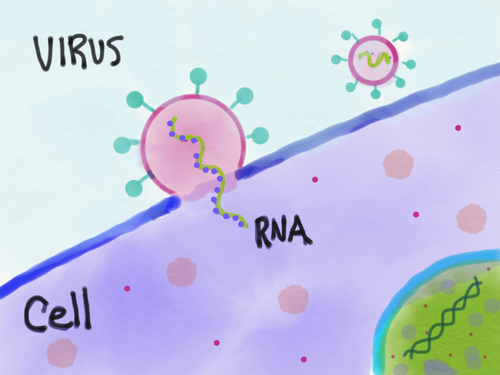 The Coronavirus is an RNA virus. That means it's genetic information is stored as RNA instead of the DNA that our cells use to pass down our genetic information from one generation to the next. The virus starts its attack by binding to one of our cells and fusing with it. Once it has done this it injects its RNA into the cell. Our own cells also use a type of RNA called messenger RNA or mRNA to copy instructions from the DNA and then carry them to our ribosomes where those instructions are used to make essential proteins.