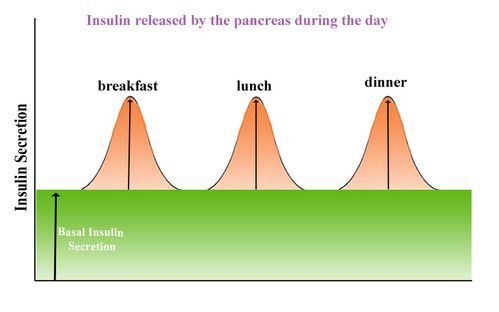 Insulin is made in the pancreas. During the day the pancreas constantly releases an amount of insulin known as the Basal Insulin Secretion. This happens even if we are not eating anything because insulin is required to get glucose into the cells where it is used for energy. Even if we have not eaten anything our liver keeps our glucose at the needed levels by making and releasing glucose and the basal insulin levels maintained by the pancreas keep our sugar levels balanced. When we eat something the rise in blood sugar is detected by the pancreas which then releases a surge of insulin in response to each meal.
